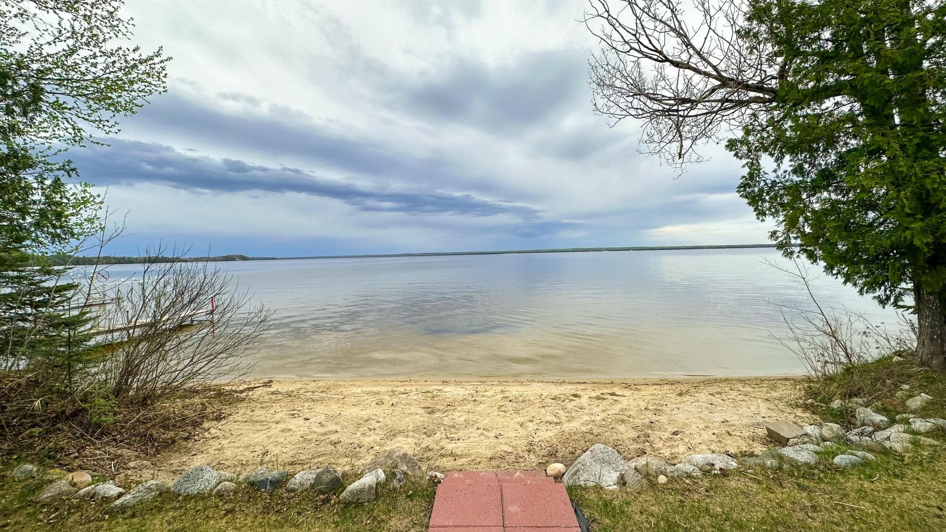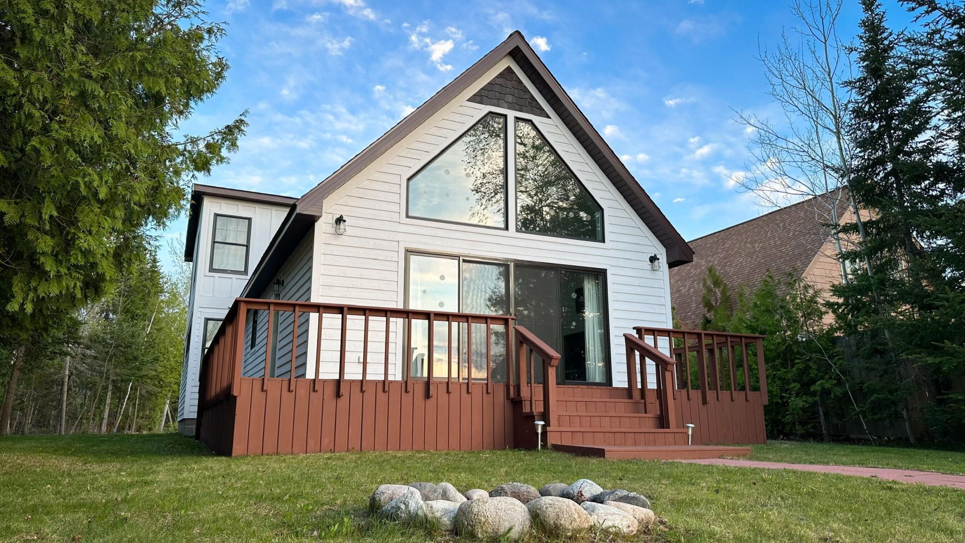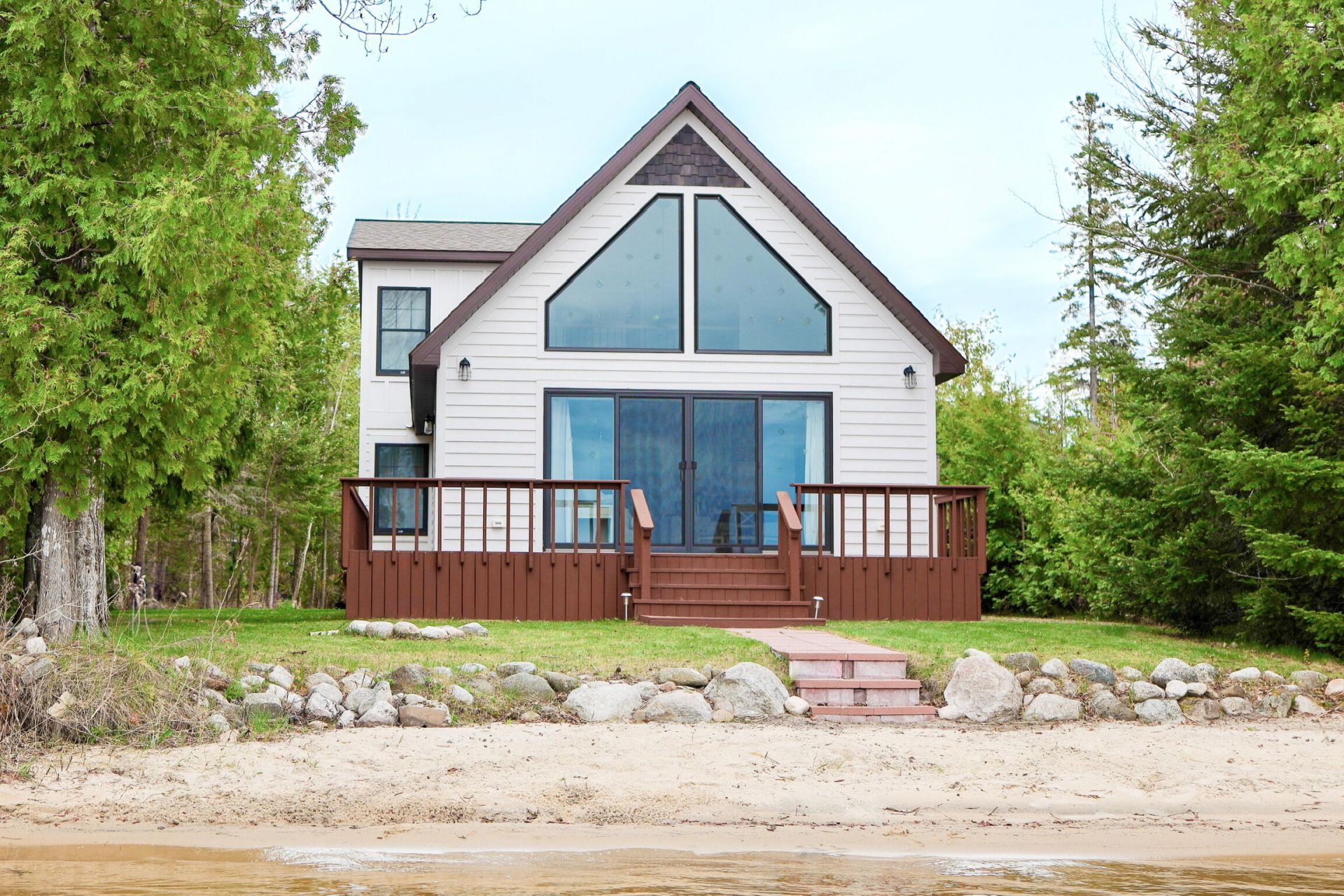 Sitting on the shores of Brevort Lake with a private sandy beach, this 3-bedroom, 2 bath lake house was designed and built with intention. The home welcomes you in with maple hardwood floors, a soaring vaulted ceiling and a dramatic floor to ceiling A-frame window that pulls your eyes straight to the lake. The kitchen is designed for those that love to cook. Beautiful butcher block counters and a stunning black farmhouse sink are set against white subway tiles and a center island with bar seating adds to the workflow. A dedicated coffee nook will delight the coffee lover. An open concept floor plan brings the kitchen, dining area and living room together for an ease to entertaining and family memories. Enjoy effortless first floor living with a main floor bedroom and a spa quality